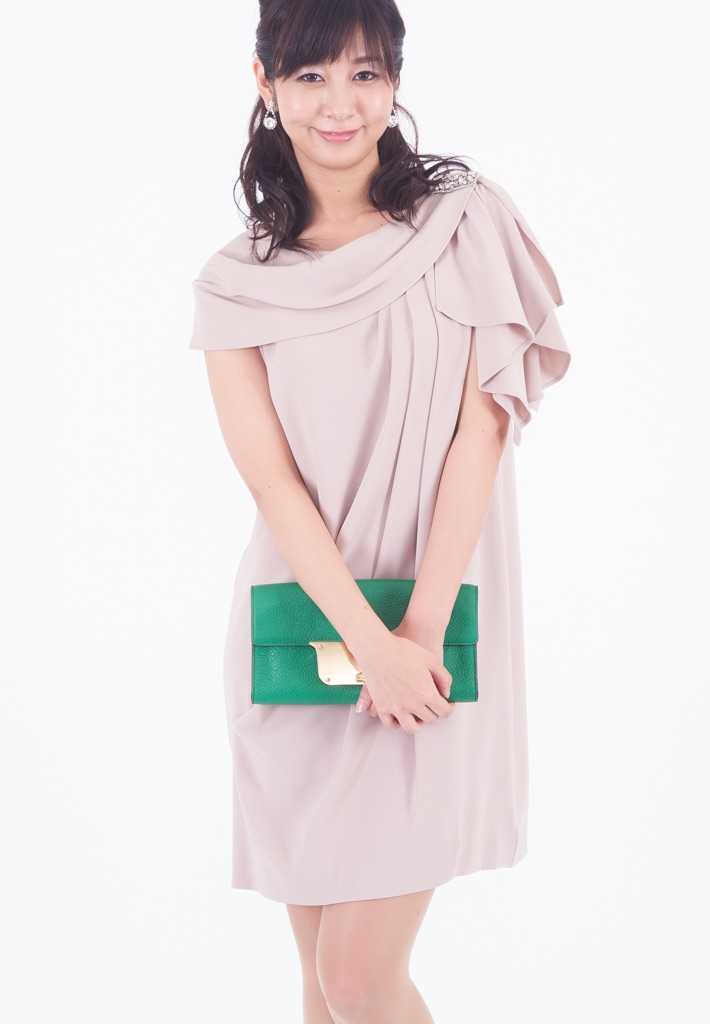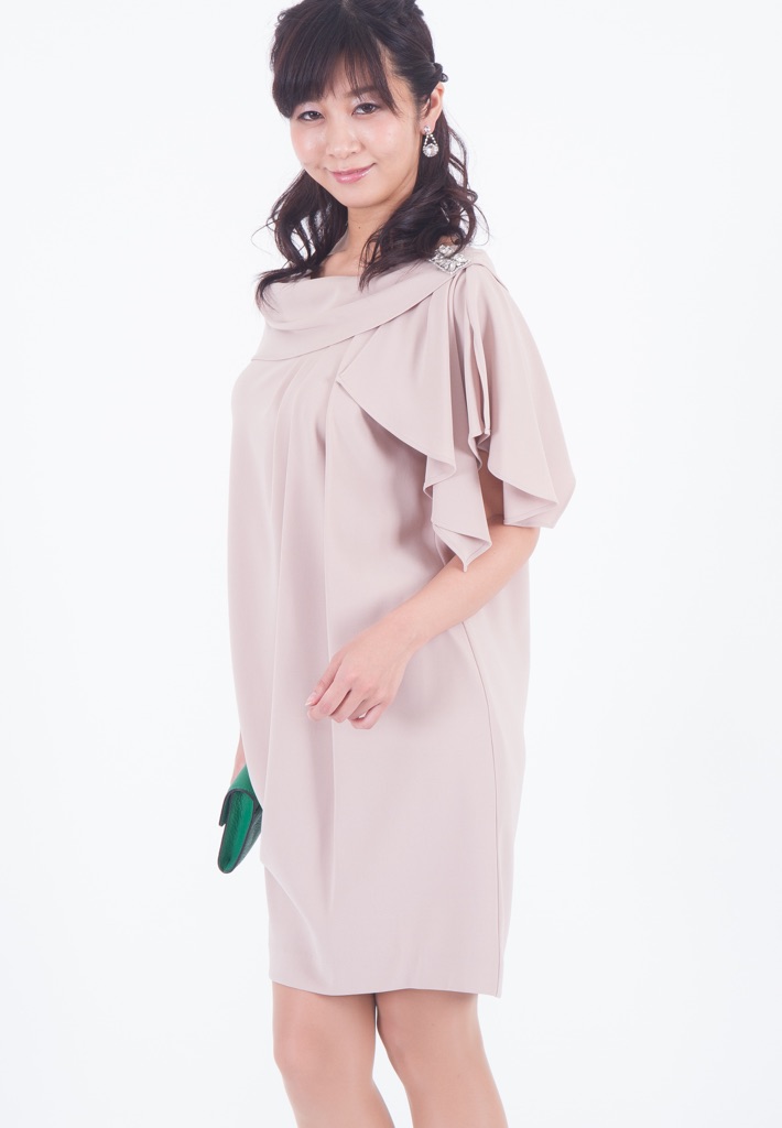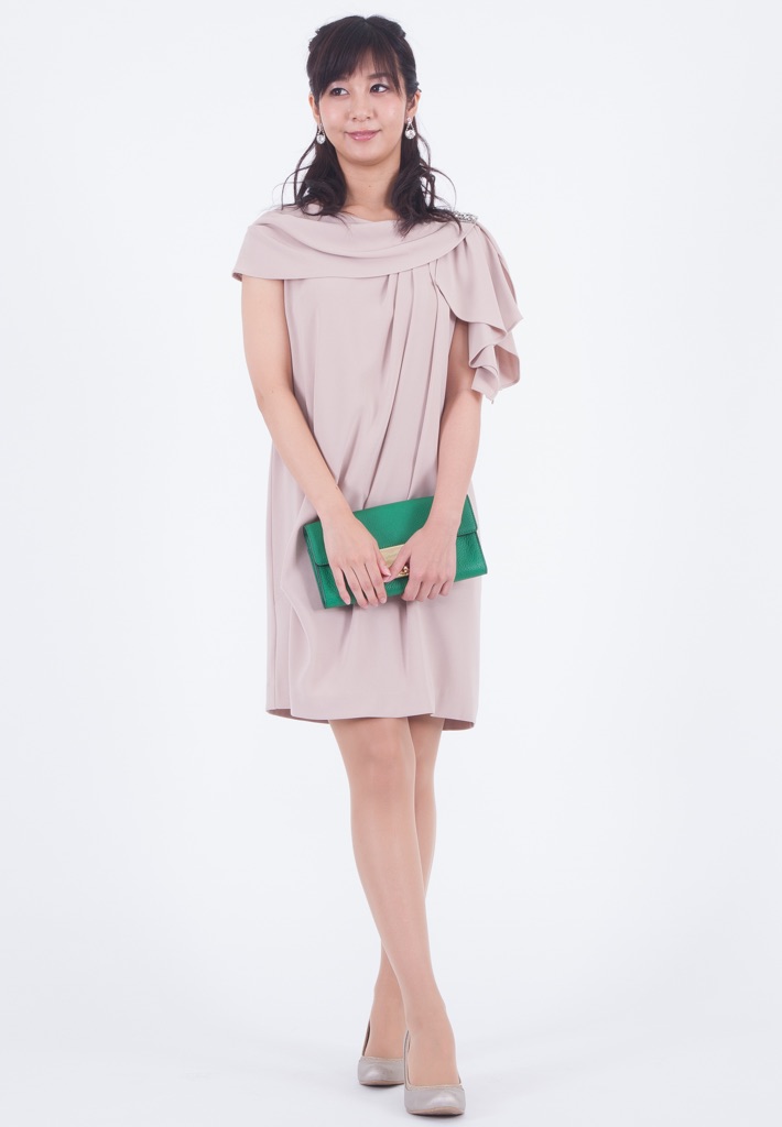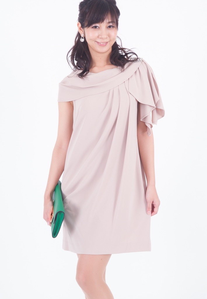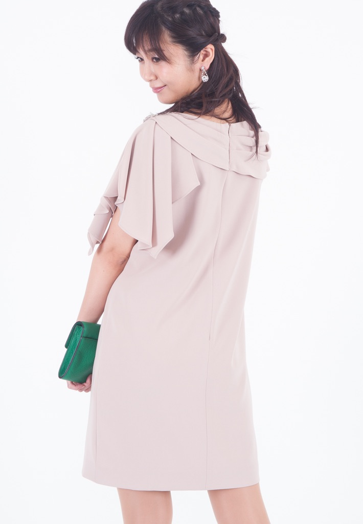 単調なイメージになりがちなサックドレス。アシンメトリーなショルダーラインでニュアンスを出すと同時に、気になる二の腕もカバーできて一石二鳥。さらに肩にはビジューもついて適度にリッチ感も。たっぷりと入ったタックがエレガントに見せます。