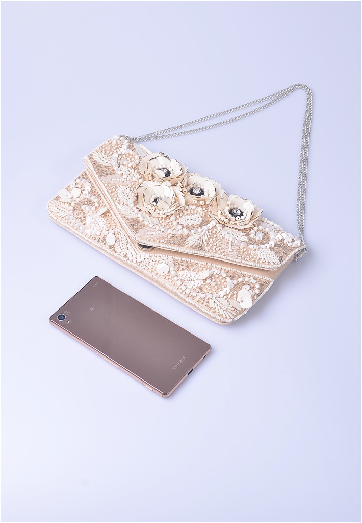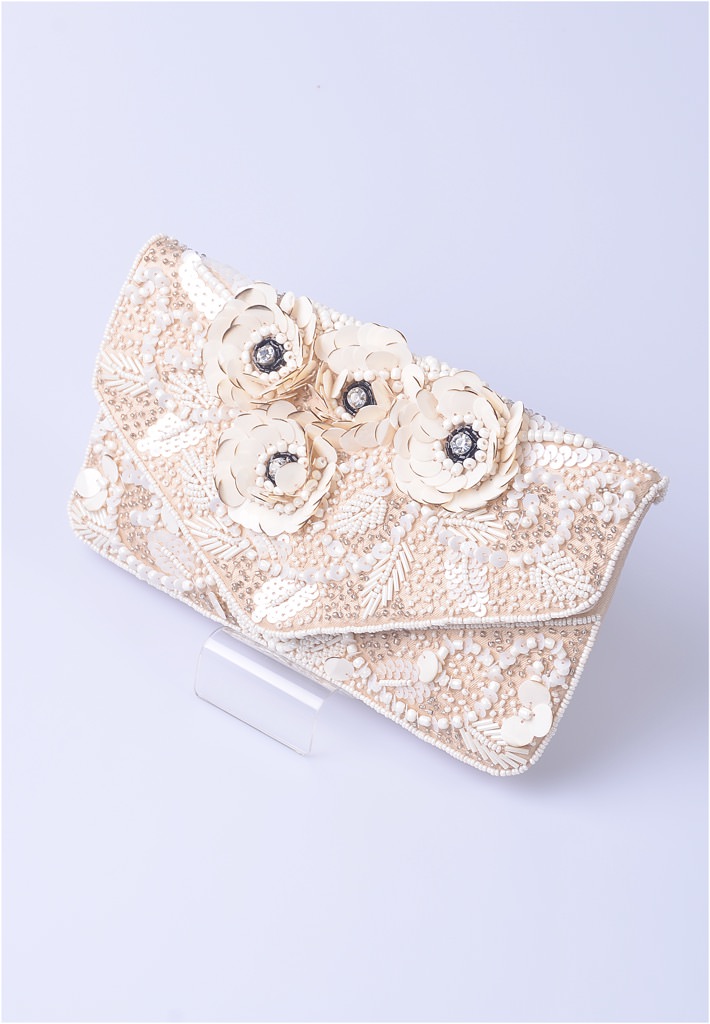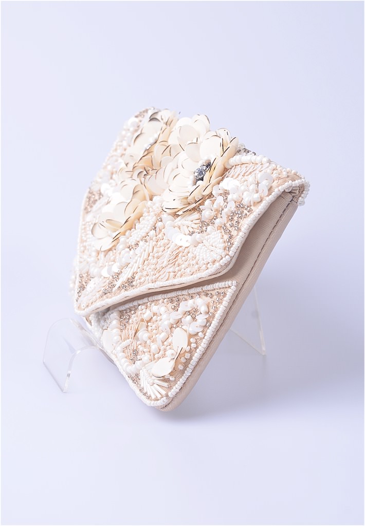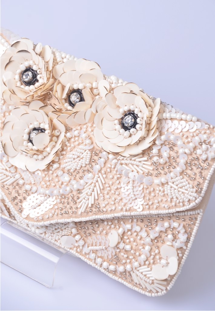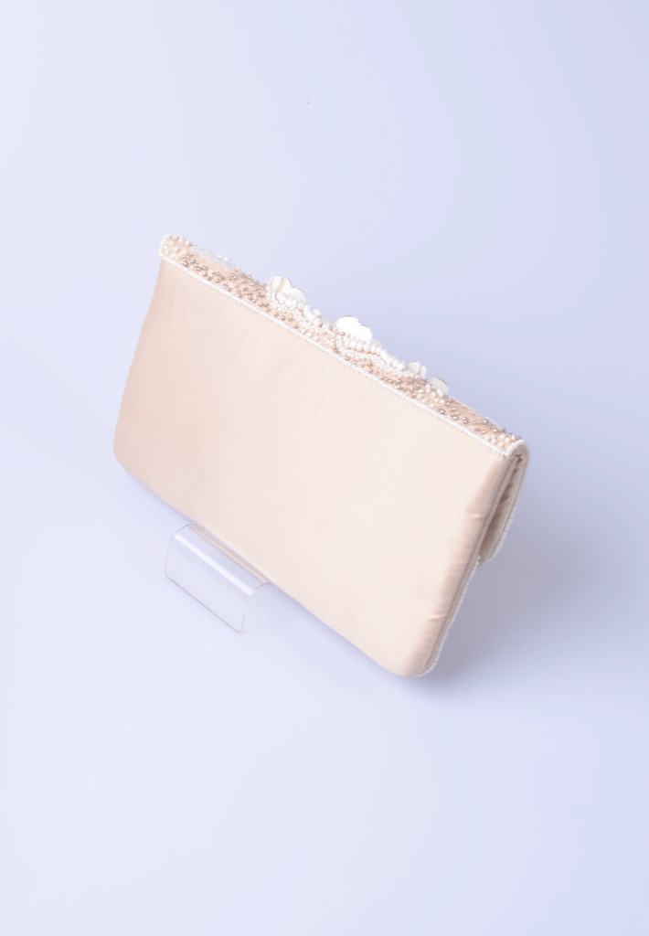 お花をモチーフにしたビーズ刺しゅうのクラッチバッグ。