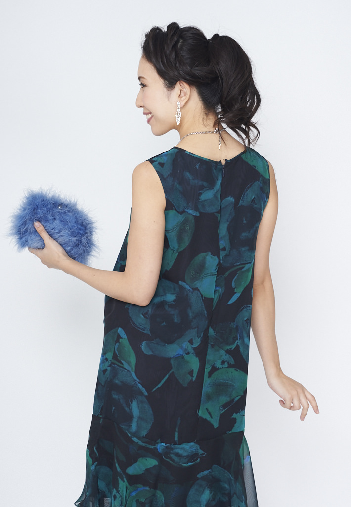 控えめな色合いで全面にプリントした大きな花柄、ミディアム丈が大人にぴったり。ボトムスはひざのあたりで透け感素材で切り替えられ、レイヤード。ほどよい肌見せが楽しめるだけでなく、動くたびに揺れ、エレガントなムードを高めます。